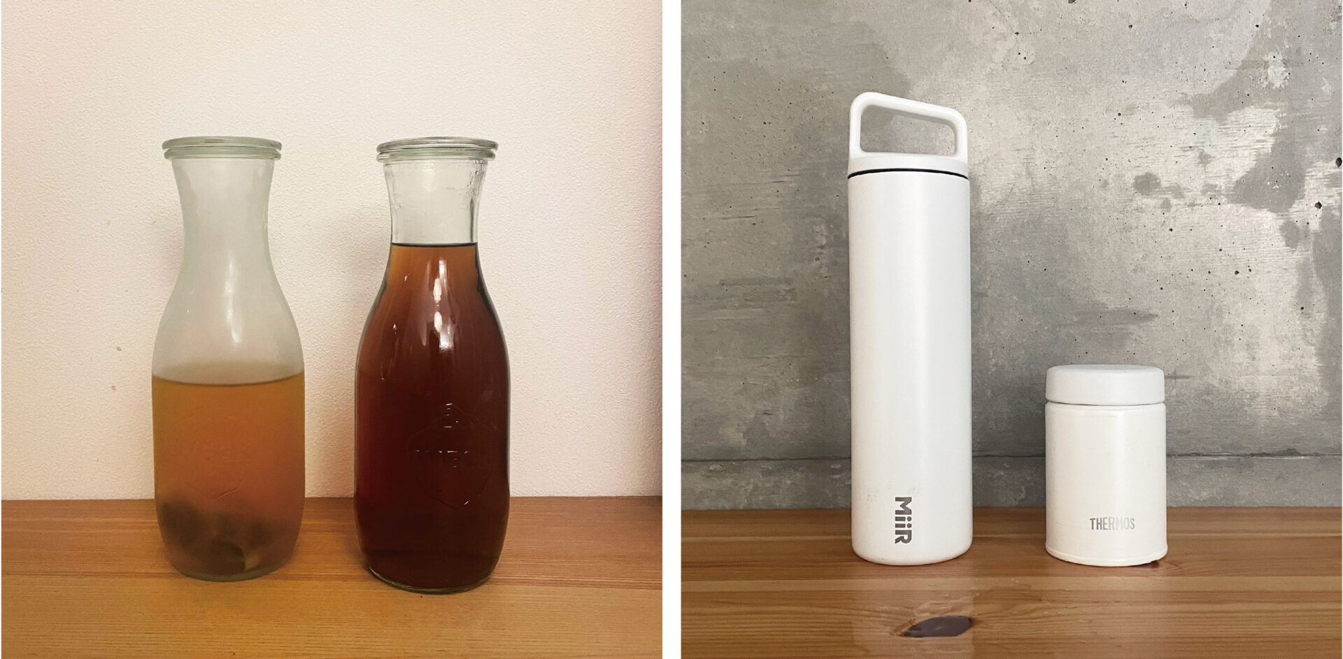 最後にご紹介するのは、お茶ポットと水筒です。お茶ポットは冷たいお茶を冷蔵庫に常備するためのもの。一人暮らしを始めた当初はペットボトルやパックのお茶を購入していましたが、自分で淹れた方がコスパが良いので、6年くらいこのWECKのポットを使っています。市販のお茶パックを入れて、その上からちょっと冷ましたお湯を注ぐだけです。(温度差80℃以内であれば耐熱OKとのこと)もっと美味しい淹れ方があるかもしれませんがお茶ライフには手軽さも大切です(笑)