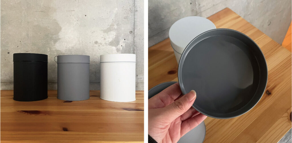 続いてご紹介するのは保存用の缶。こちらは以前小さな収納をご紹介した時にも掲載しましたが、なんと2つ増えて3つに!白い缶が煎茶、グレーが紅茶、黒がコーヒーという感じで使い分けています。茶葉のまま入れているわけではなく、袋に入った茶葉を数種類一緒に収納しています。ノーブランドっぽさがお気に入りで、写真のように中まで色がついているのも良いです。購入は、OGAWA COFFEE LABORATORYの下北沢店か桜新町店へ!もしかするとオンラインでも購入できるかもしれません。
