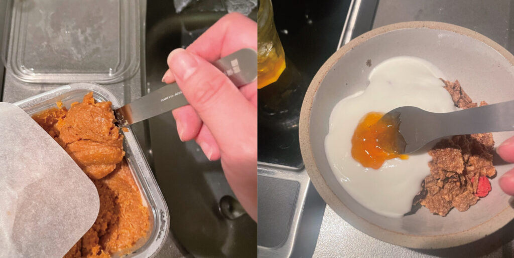 何が一番の魅力かというと“平”であること。例えば、ジャムをヨーグルトにかけるときや、味噌汁の味噌をとく時にスプーンのくぼみに溜まってもう一本スプーンを使ったり、お皿の縁にトントンすることはありませんか?このスプーンはヘラのように使えるので、そういった小さなストレスがなく使用できます。他に使っているスタッフから、アイスクリームを食べる時に使うと熱伝導で溶けやすいという噂も聞いたので、試してみようと思います。