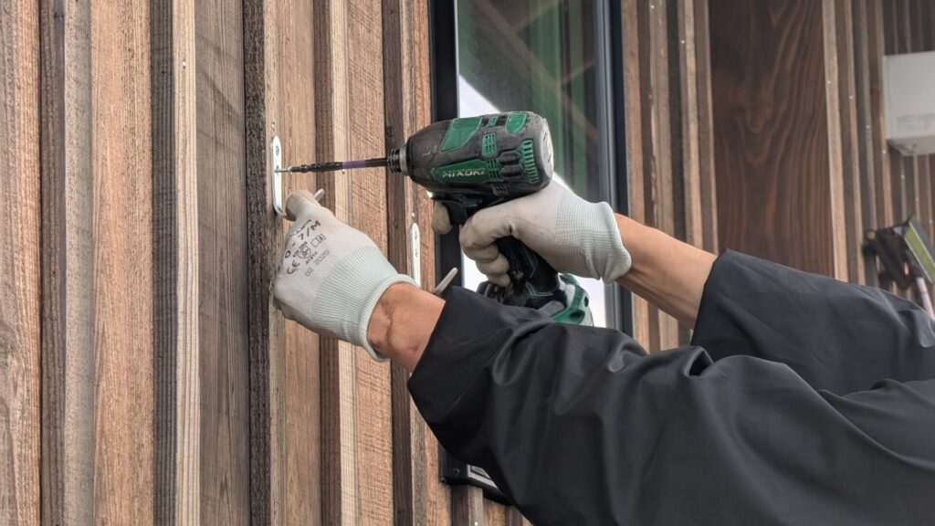 外壁が板張りのため、直接フックをビス留め。