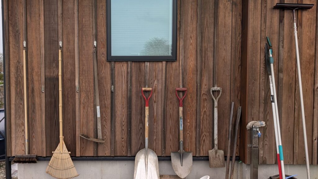 建物の北側に畑が広がる我が家ですが、おなじく北側の壁面にスコップやクワなどを収納していきます。