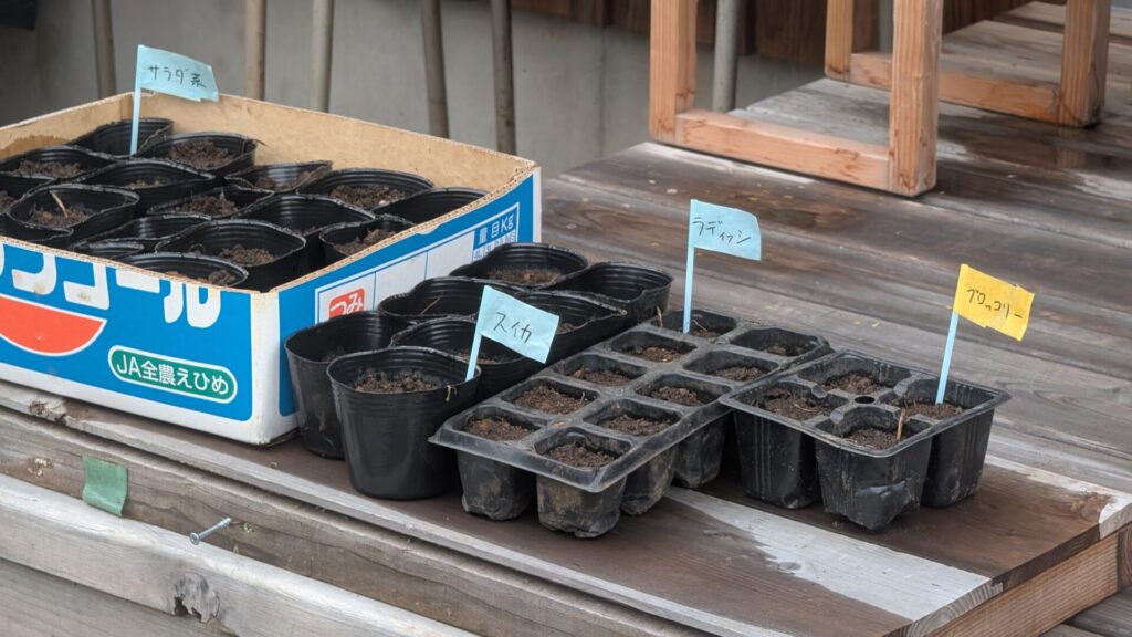 農協で種を購入し、ポットに植えて苗を育てはじめました。