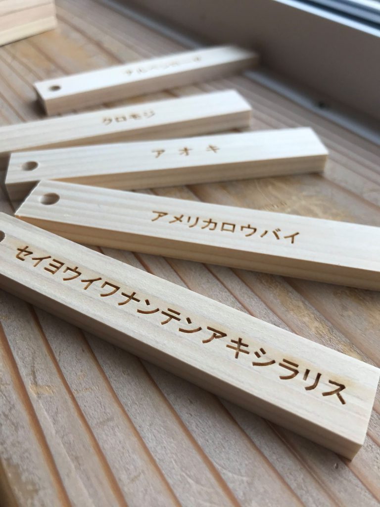 2020年3月22日(日)のワークショップで取り付ける樹木札(多摩産材ヒノキにレーザー加工)