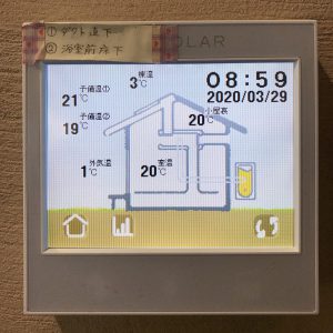 OMソーラーのパネルで確認すると、9時ごろに外気温1℃で室温20℃。