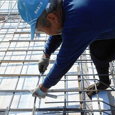 「基礎」とは、主に地面に接して家を支えるコンクリートの部分のこと。基礎が正確かつ丈夫でなければ、しっかりした家はできません。それほど建物の要となる部分なのです。基礎は、遣り方・根切り・均しコンクリート・鉄筋組み立て……など、とても多くの工程を経て造られます。周囲の環境にも気を配りながら、後々メンテナンスがしやすい形を選び、強い基礎をつくり上げていきます。そんな綿密な仕事ができるのは、腕のある鳶職人がいてくれるからこそなのです。
