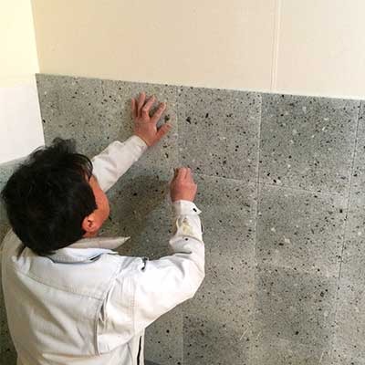 キッチンや洗面所で好まれる細かいモザイクタイルから、土間に大胆に配置される大谷石まで、タイル職人さんの腕の見せ場はさまざま。木・土・紙で構成される日本の家は、石やタイルをあしらうとちょっとしたアクセントになり、より表情豊かな味わいある住まいになります。タイル貼りのポイントは、慎重かつ手早く作業すること。一見同じ大きさに見えるタイルですが、焼き物ゆえに一枚ごとに微妙なクセがあります。そのクセを読みつつ全体の形を整え、最後の1ピースを何事もなかったようにピタッと納める。細かな観察眼が仕上がりを左右する職人技です。
