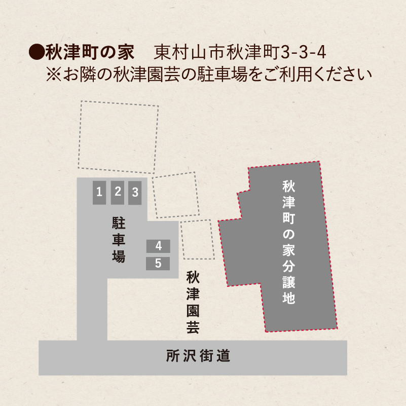 東村山市秋津町3-3-4 ※駐車場は秋津園芸敷地内をご利用ください