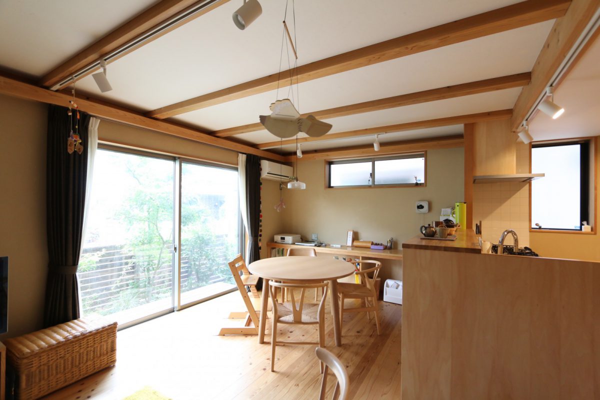 敷地の南と北が道路になっています。玄関は北側に、そして南には大きな窓を備えたLDKが広がります。LDKは15帖の広さです。キッチンからダイニング越しに庭の木々が目に入ります。