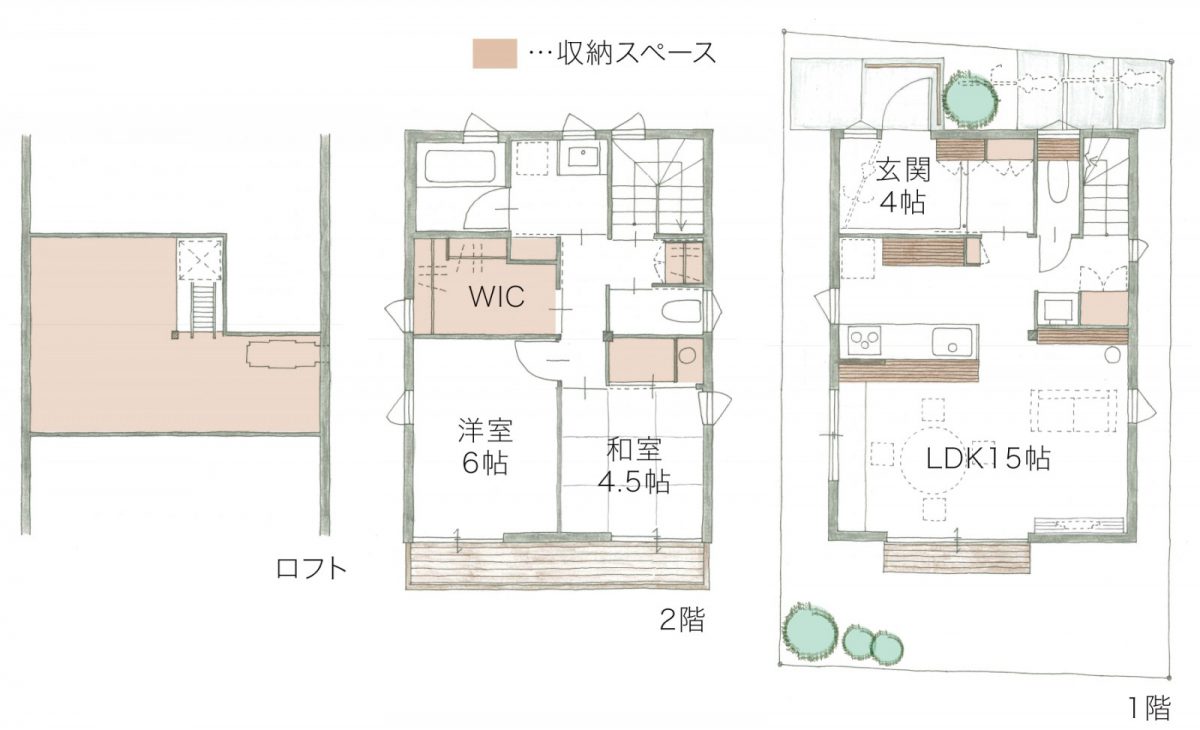 よりスッキリ暮らせるように収納スペースを徹底して設けました(間取り図の網掛け部分)。キッチン、洗面の水回り部分はもちろん、意外と小物が多いリビング、ダイニングにも収納を備えます。玄関は4帖ありロードバイクがしっかり納まります。