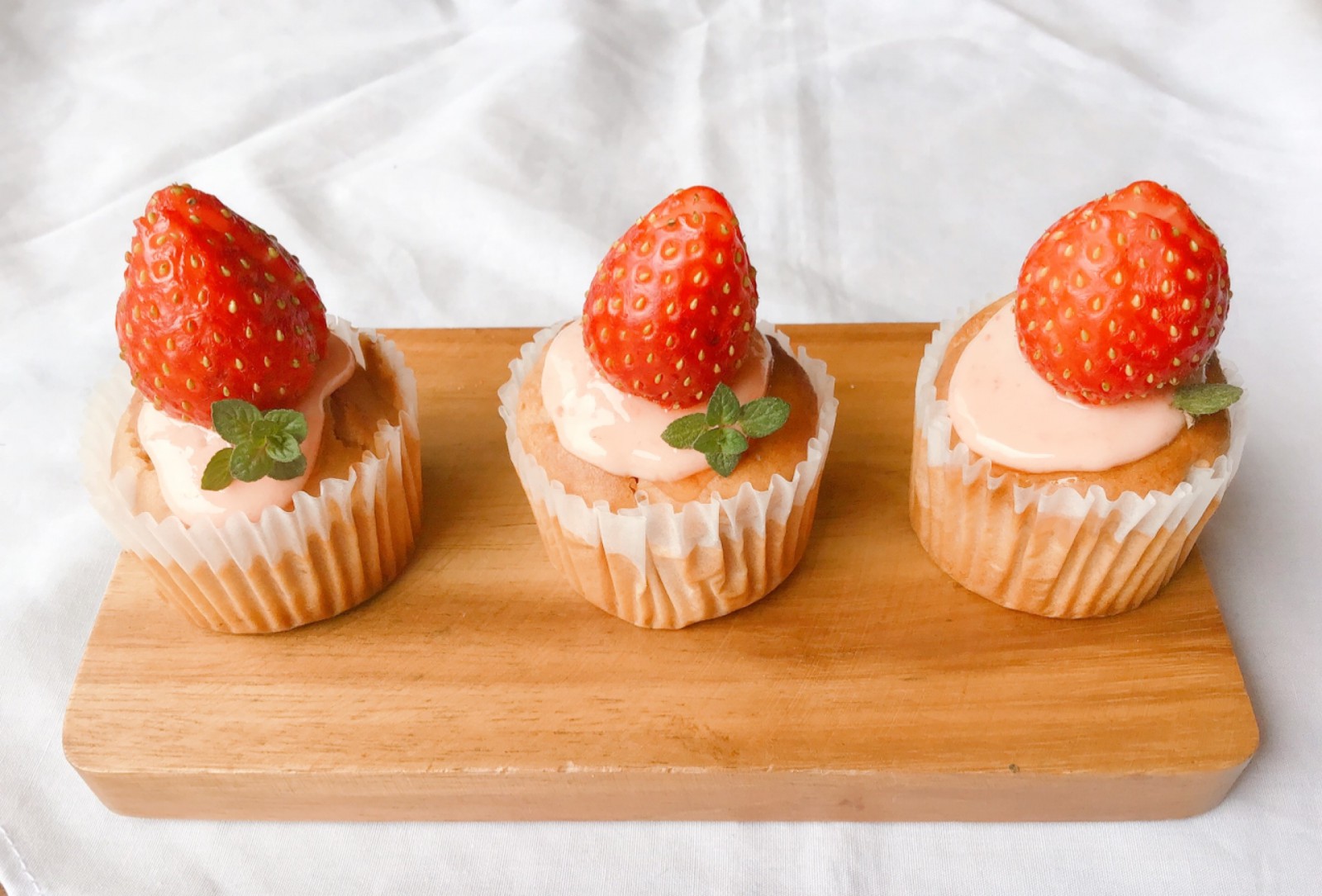 焼いている間にこちらで用意したマフィン2個にアイシングクリームと苺でデコレーション。
