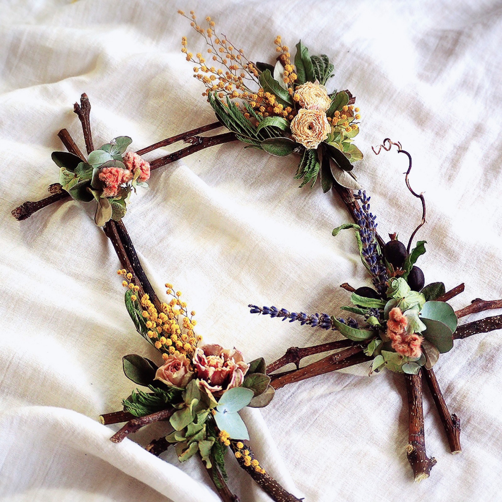 枝を組んでフレームをつくり、チューリップやミモザなど春のドライフラワーでアレンジします。