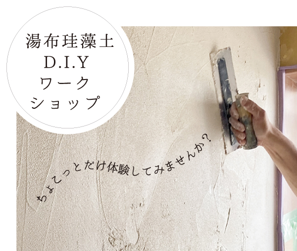 あいばこのリフォームに多く採用されている「湯布珪藻土」は調湿・防虫作用に優れている珪藻土。傷がついてもお施主様が補修ができるのも特徴のひとつ。そんな湯布珪藻土を塗る体験もお楽しみいただけます。左官屋さん気分で大人でも楽しいですよ。
