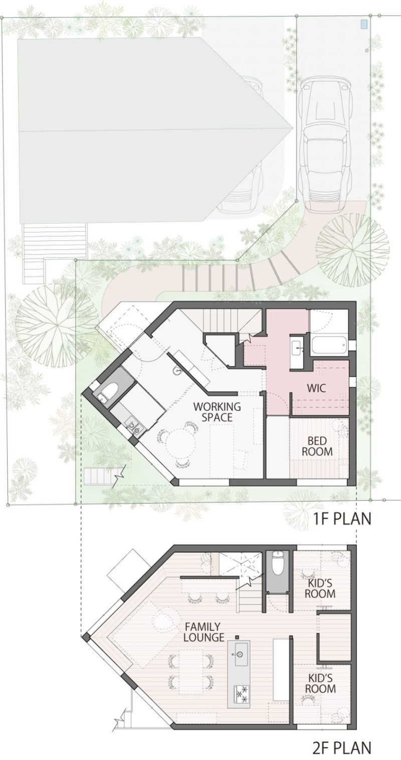仕事場と暮らしを分けるための、くの字に曲がった壁、子供たちのプライベートを尊重するための、屋根まで届く大きな壁。お互いに見え隠れしながら、きっちり仕切ることなく、何となくつながっています。