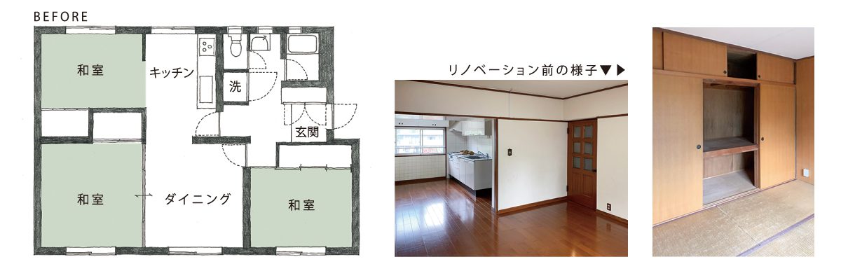 複数の居室に別れていた既存の空間から、オープンなひとつながりの大きなLDK空間を中心に生活動線を設計。これまで、私たち相羽建設でお手伝いをさせていただいた団地リノベーションの中でも一際大きな空間が生まれました。