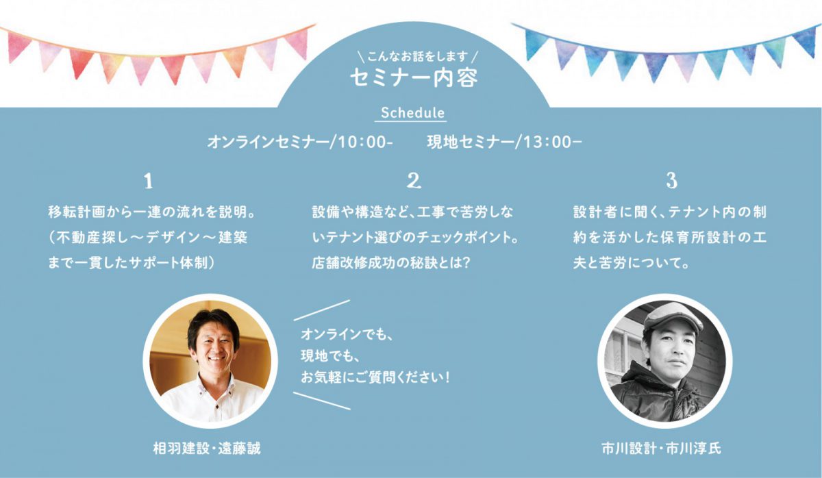 - オンラインセミナー&見楽会…10:00-11:30、現地セミナー…13:00-14:00、現地見楽会…14:00-16:00