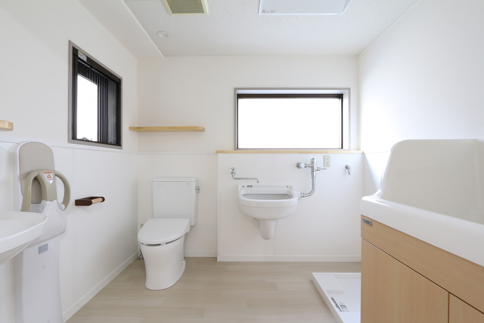 全体が淡い色味で統一され、子どもたちがゆったり広々と過ごせる、