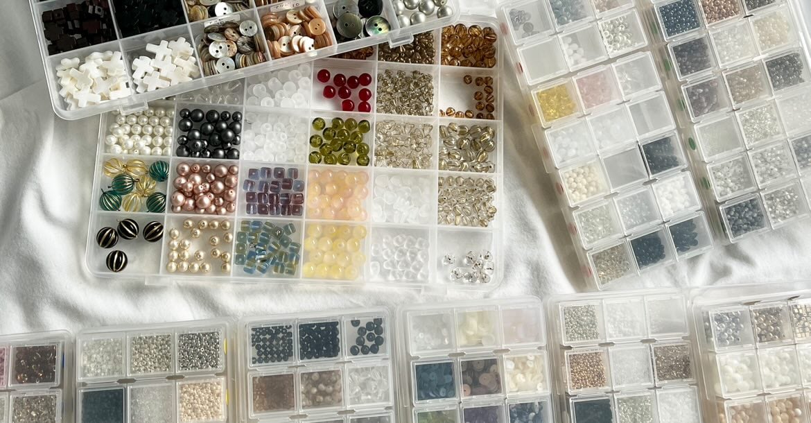 ガラスビーズやシェル、パールなどをひとつぶずつ丁寧に刺繍して作るアクセサリーです。