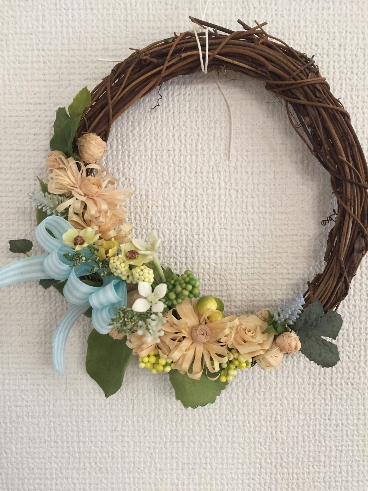 大工さんが木材をカンナで削って出来たカンナ屑を、自然木の良さそのままにリボンにしてマーガレットなどのお花をつくります。それをグリーンや青いリボンで飾り付けて初夏を思わせる爽やかなリースにしあげます。
