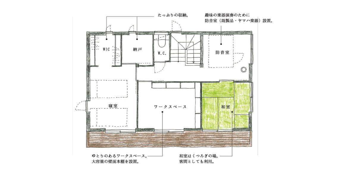二階は寝室と和室に加え、奥様のワークスペースとご夫婦の趣味の楽器演奏を楽しむための防音室を設置します。