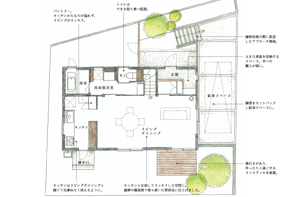 また、古くなった擁壁を改修する際に駐車スペースを設けられるように形状を変更。玄関の物置スペースは大きめの楽器を置くためのもので、練習へ行く際に車への搬入をしやすいようにしています。