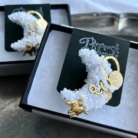 ガラスビーズやシェル、パールなどをひとつぶずつ丁寧に刺繍して作るアクセサリーです。