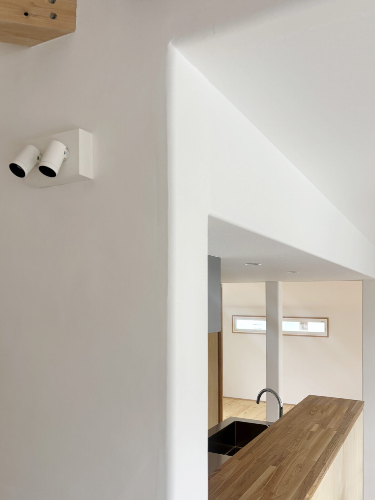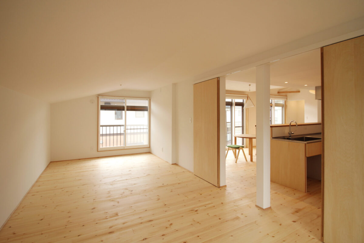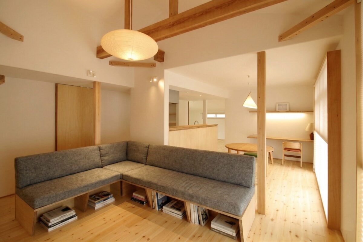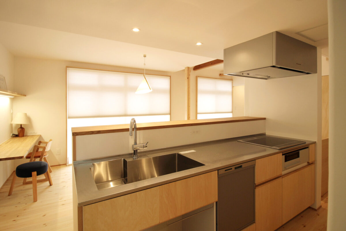 リビングは天井を抜いた吹き抜けとし、既存の梁をあらわしています。 LDKは一体型とし、対面キッチンから空間全体を見渡せる計画に。