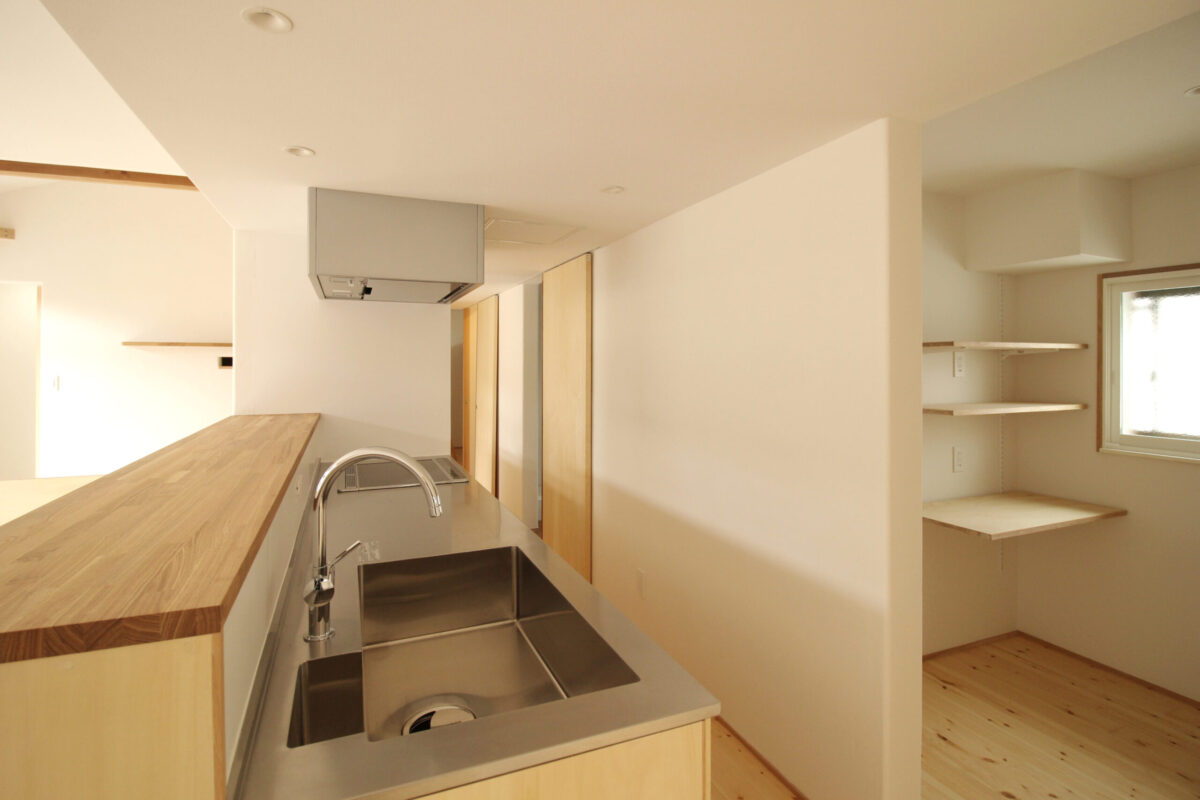 背面にはパントリーを設け、そばにはお子さまの勉強スペースを配置しました。