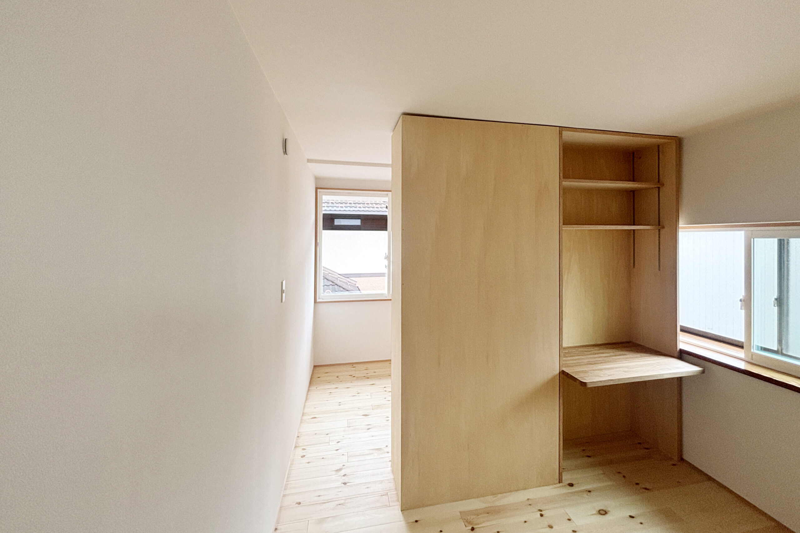 7.5畳の子ども室には、両側から使えるデスク付きの間仕切り収納を造作しています。