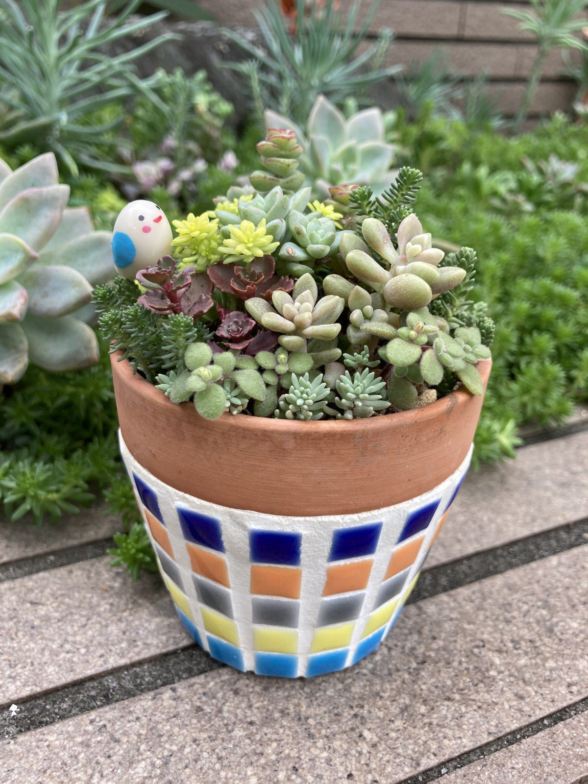 素焼き鉢にタイルを貼ってオリジナルのタイル鉢を作り、たくさんの多肉植物で寄せ植えをして可愛く仕上げましょう!