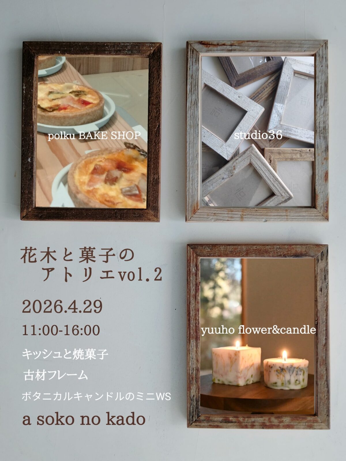 焼菓子、キャンドル、古材フレーム屋さんがa soko no kado に集まります。