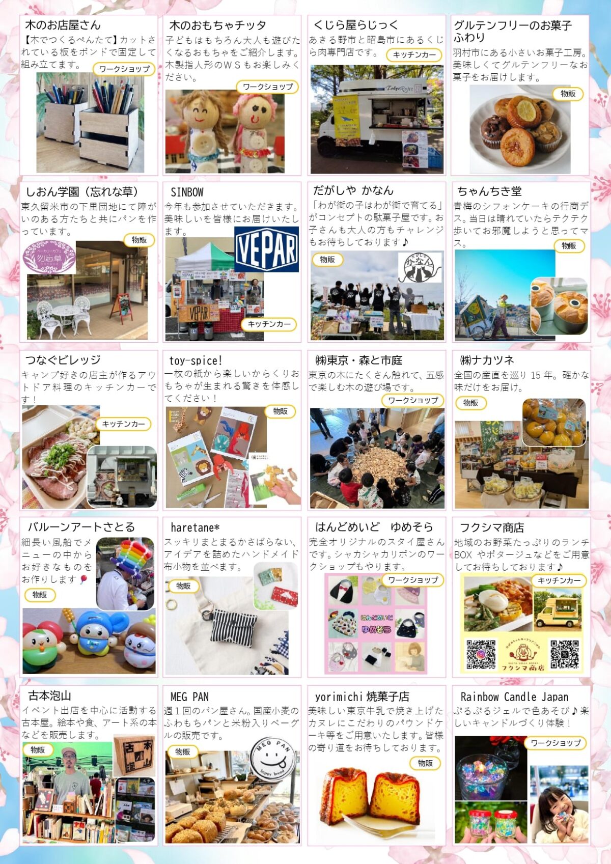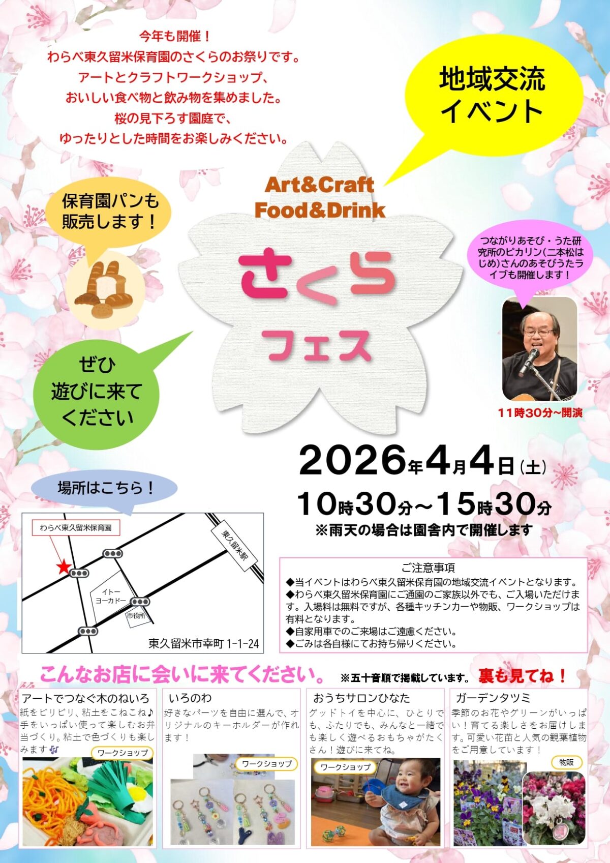 - わらべ東久留米保育園にご通園のご家族以外でも、ご入場いただけます。入場料は無料ですが、各種キッチンカーや物販、ワークショップは有料となります。