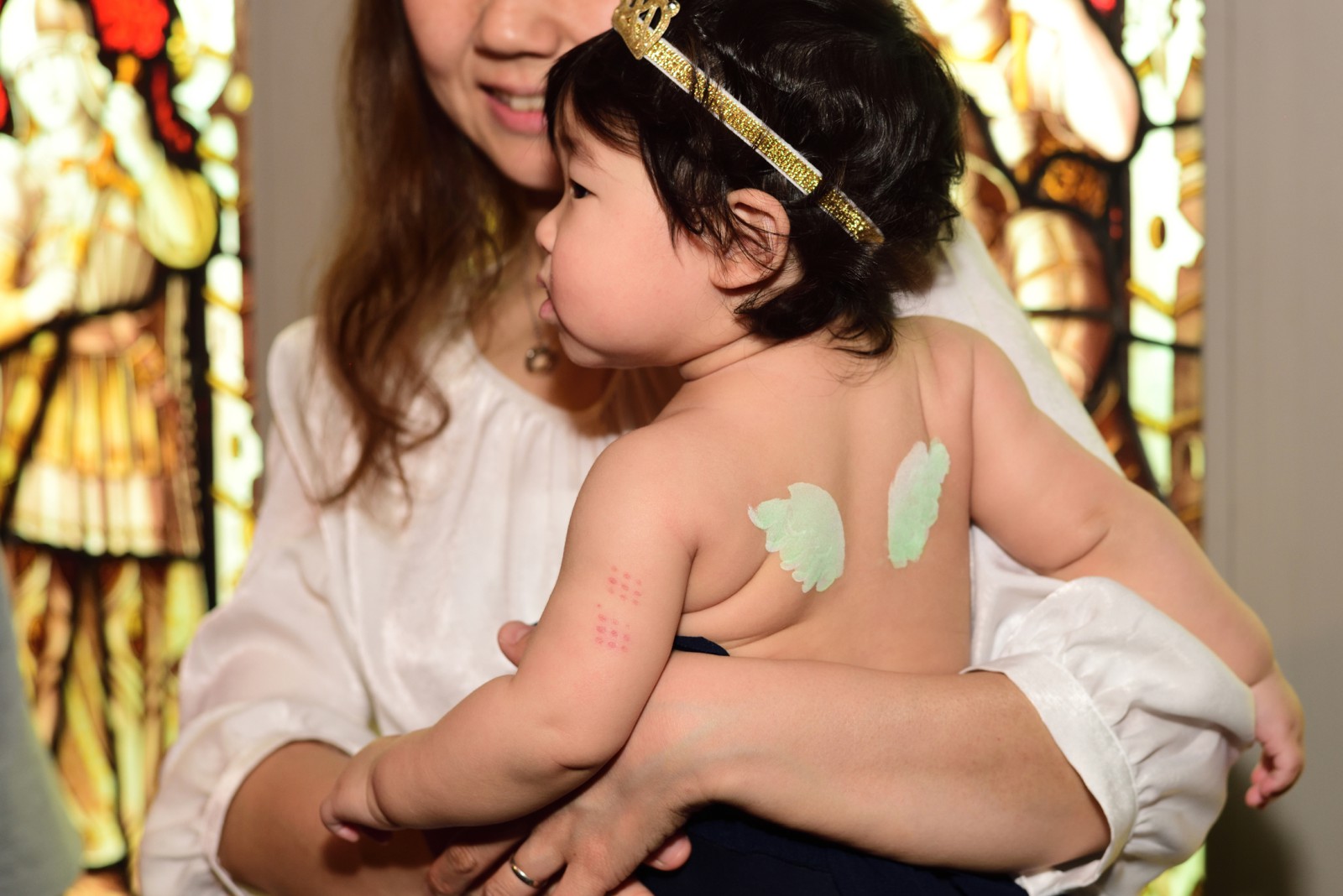 安全な絵の具でお子様の背中に天使の羽をペイントし、