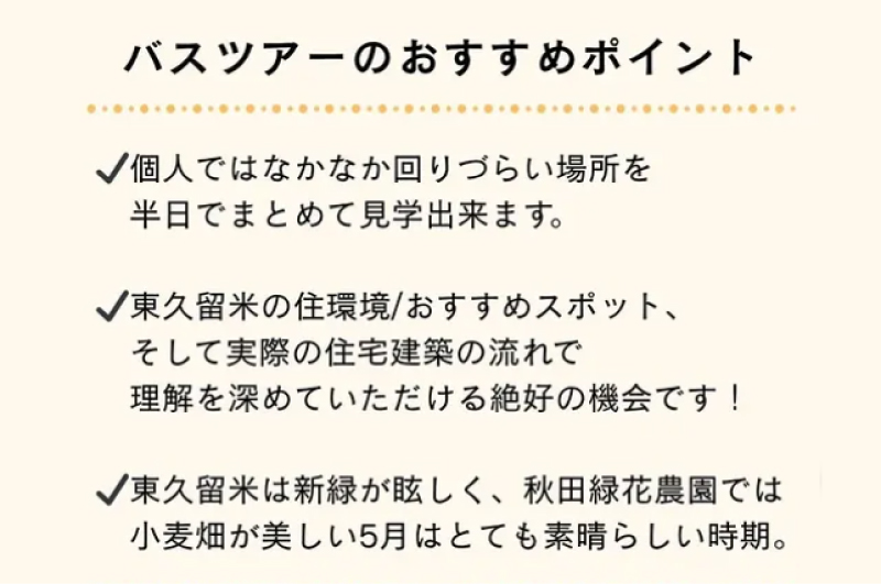 自然豊かな東久留米のおすすめスポットや、建築予定地、街全体の植栽が印象的な相羽建設のタウンを巡りながら、街の魅力や“集まって暮らす”豊かさを体感していただけるツアーです。