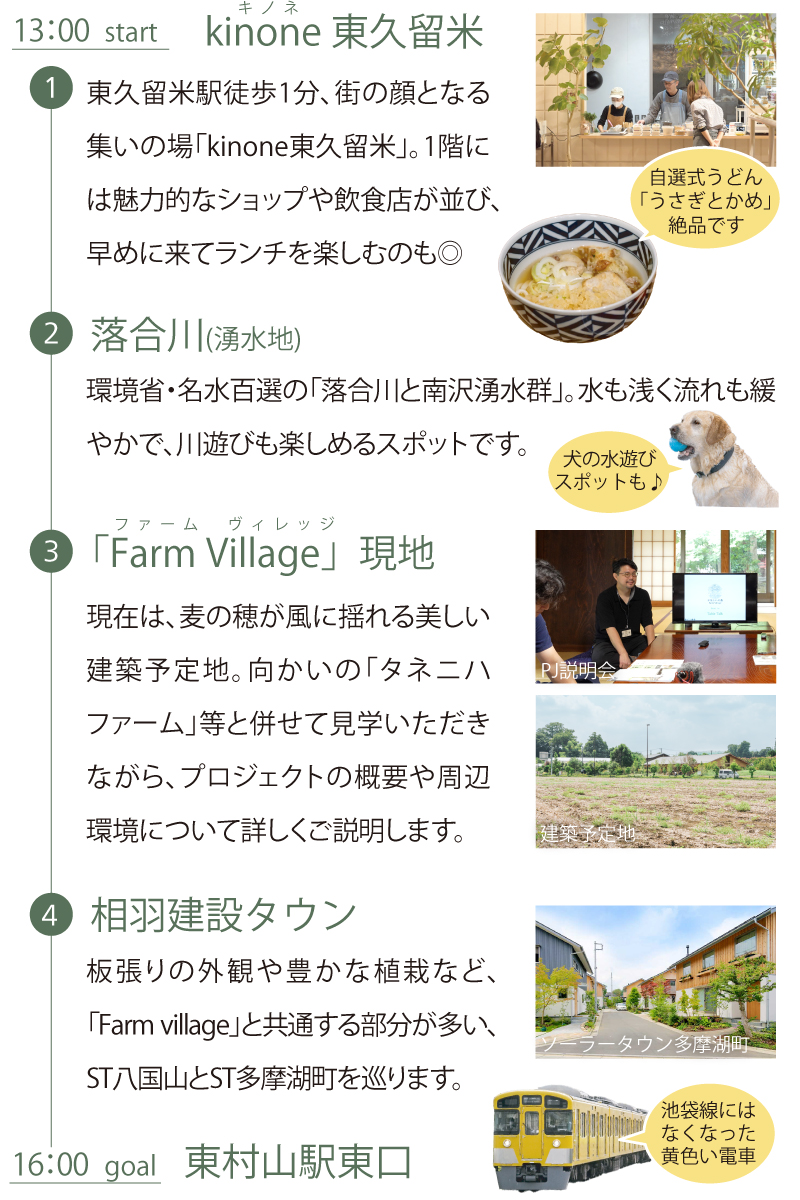 - 集合:kinone東久留米(東京都東久留米市本町1-4-6)、解散:東村山駅東口
