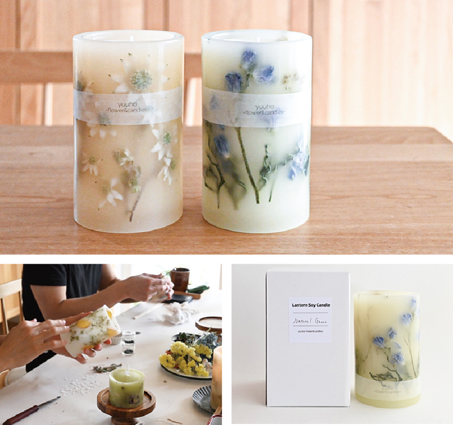 ランタン状に燃焼して内側から照らされるドライフラワーが綺麗なキャンドルです。燃焼部分はススの出にくい植物性ソイワックスを使用します。