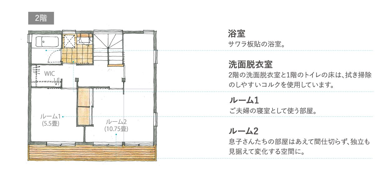 2階の3人兄弟のための個室はあえて仕切らず、ゆるやかに空間を分けられるようにしました。将来独立されて家族の暮らしが変わっても、住まいが寄り添うような設計を心がけました。