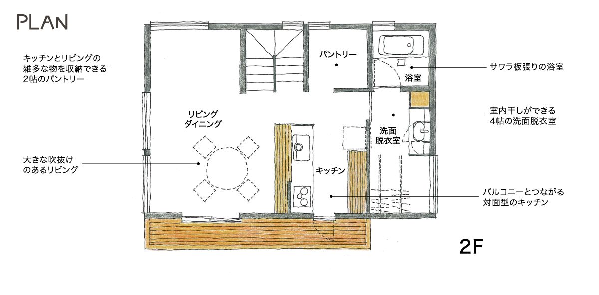 ②家族の成長とともに様々な使い方ができるような仕切りの少ない部屋と収納です。