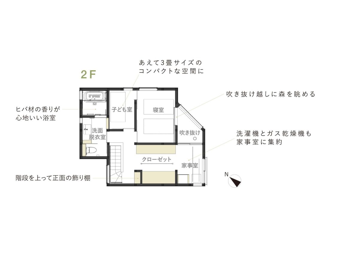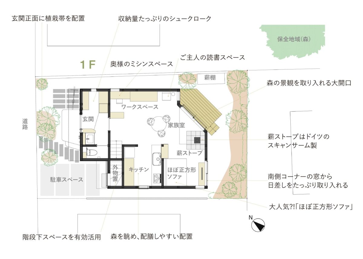 ● 籠り感のある正方形ソファ、書斎コーナー、薪ストーブコーナー、吹き抜けに面した寝室、北側の森が感じられるお風呂など、心地よい居場所を点在させています。