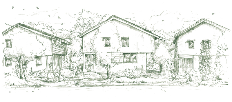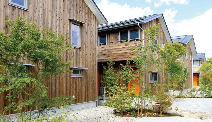 映画「となりのトトロ」のモデルになった八国山緑地のほど近くにあるソーラータウン八国山。自然豊かな環境で太陽熱を利用するOMソーラーを全棟に搭載し、板張りの外観や造園家の小林賢二さんによる美しい庭など、日本の原風景を感じる街並みになっています。