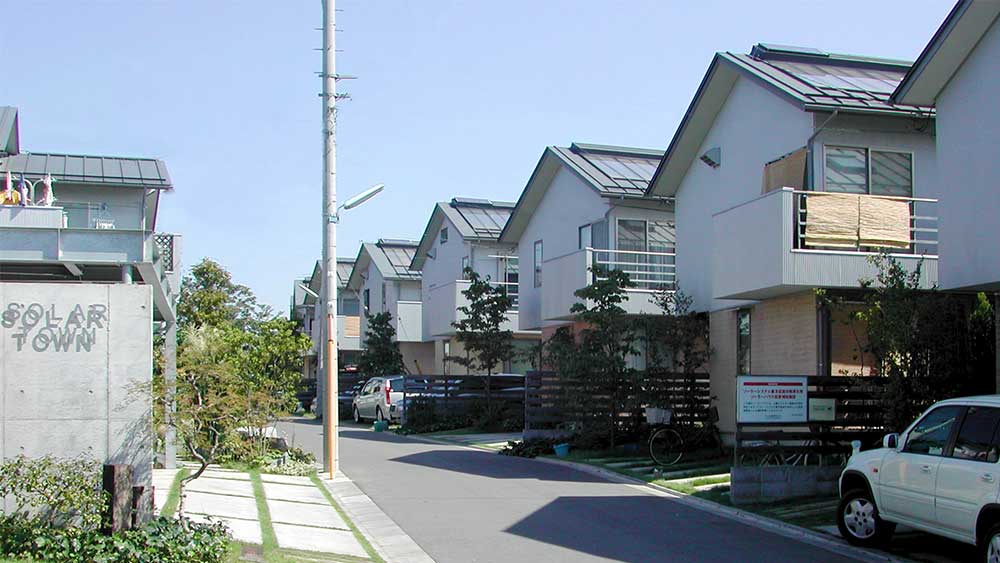 東京都のまちづくりプロジェクト「むさしのiタウン」。東村山市に生まれたエコタウンの一角に、OMソーラーを搭載した木造ドミノ住宅が25棟あります。木造ドミノの開発のきっかけとなったソーラータウンプロジェクトでした。10年以上を経た街の佇まいをご覧いただけます。