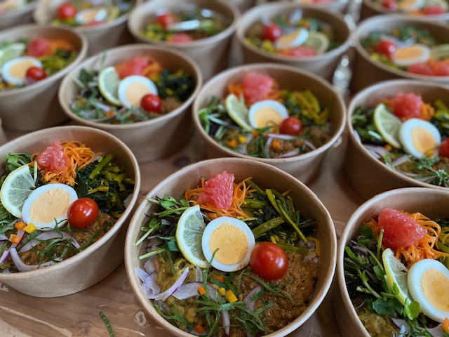 スパイスカレーの2種盛りとお惣菜が詰まったお弁当をお持ちします。