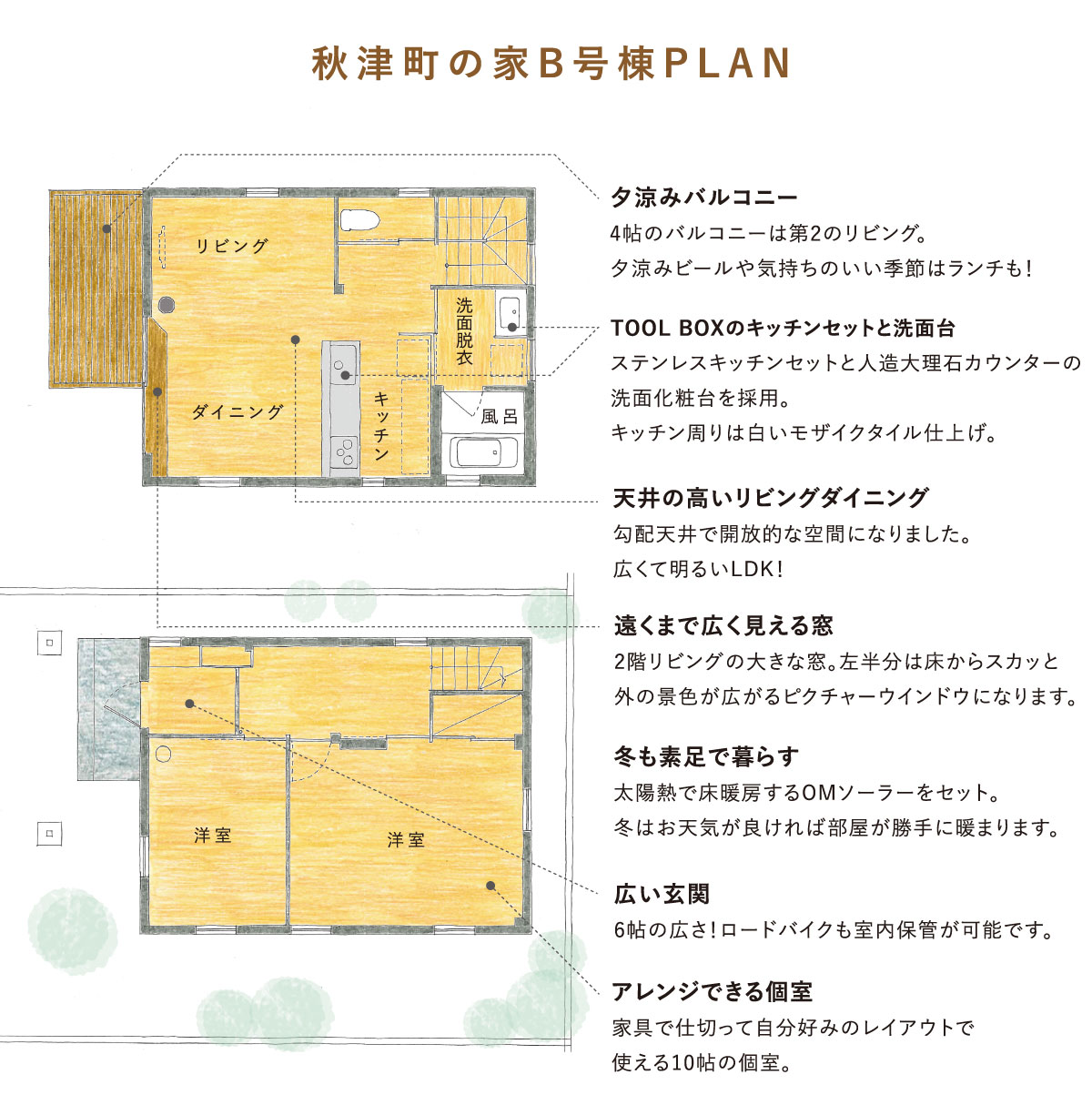 全3棟のうちの真ん中に建つB号棟の完成見楽会を行います。B号棟は大きなバルコニーから隣家の植木屋さんの緑を望む眺望が魅力の2階リビングの住まい。既に賃貸としてご紹介しているA号棟も一緒にご覧いただけます。どちらもオープンな間取りが特徴。家の敷地で小商をする「住みびらき」や、家で仕事をしながら暮らす「くらしごと」など郊外暮らしならではのライフスタイルをご提案します!