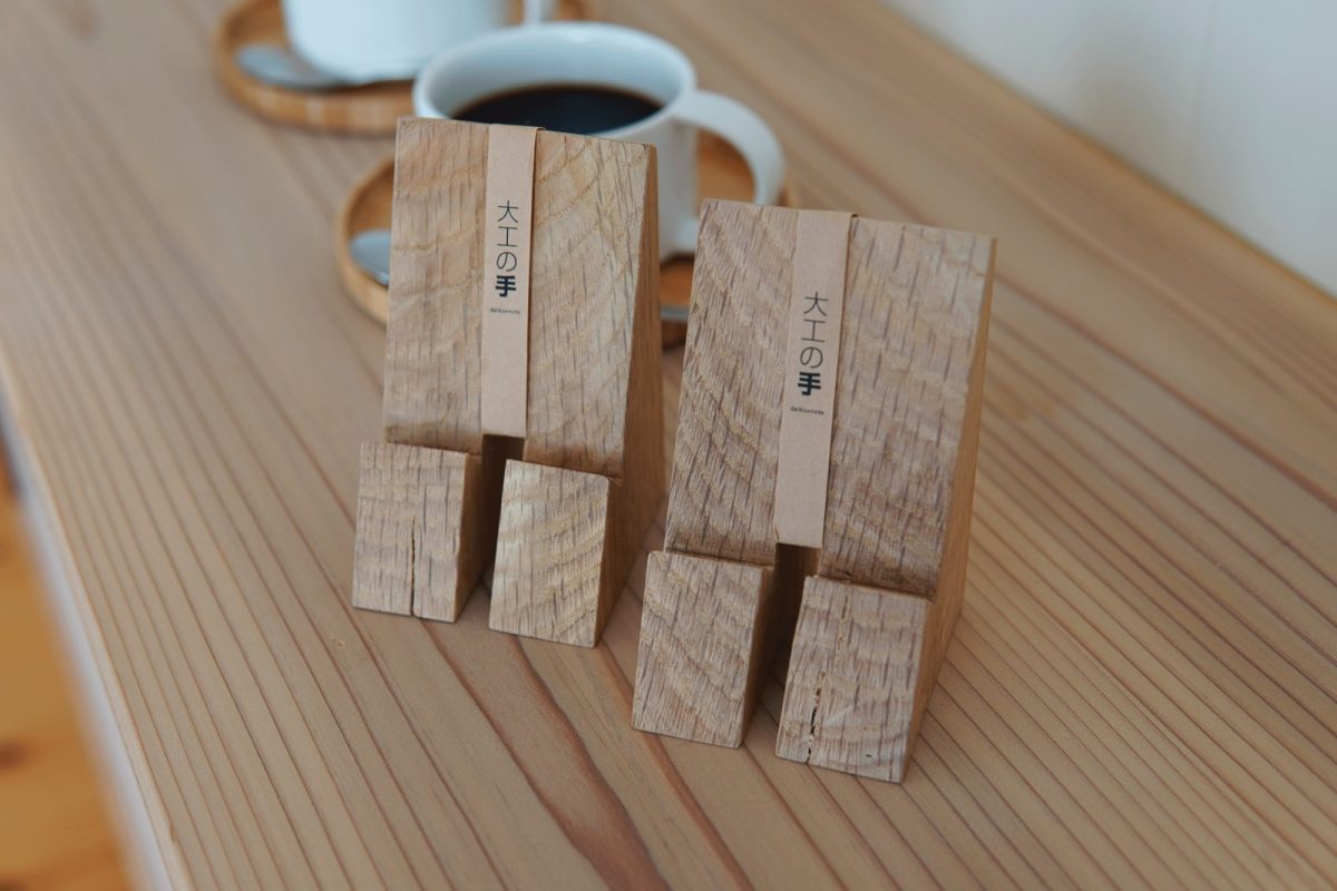スマホスタンドは、家具デザイナーの小泉誠さんとのコラボレーションによって企画開発した製品。大工の手によって型取られたものをご自身の手で良い具合にやすり、蜜蝋を塗って仕上げていきます。