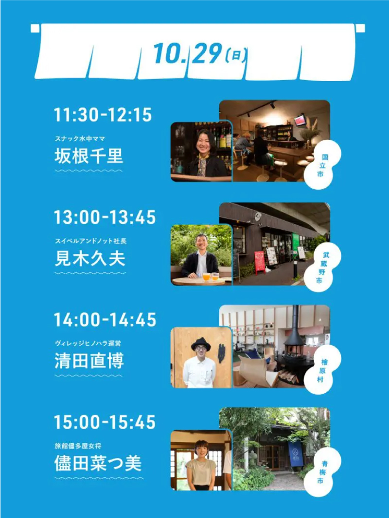 けやき出版代表の小崎さんが女将となり、各エリアのゲストたちとそれぞれ多摩のことを語り合います。