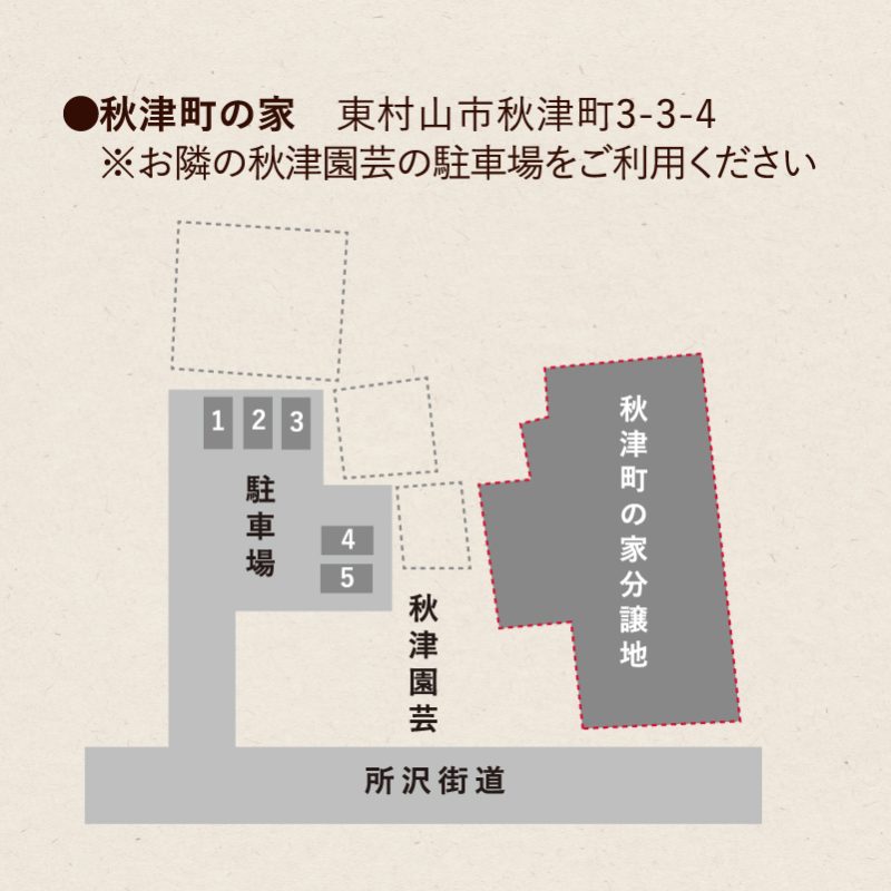 秋津の家にお越しの際は、秋津町の家分譲地のお隣、秋津園芸さんの駐車場をご利用下さい。