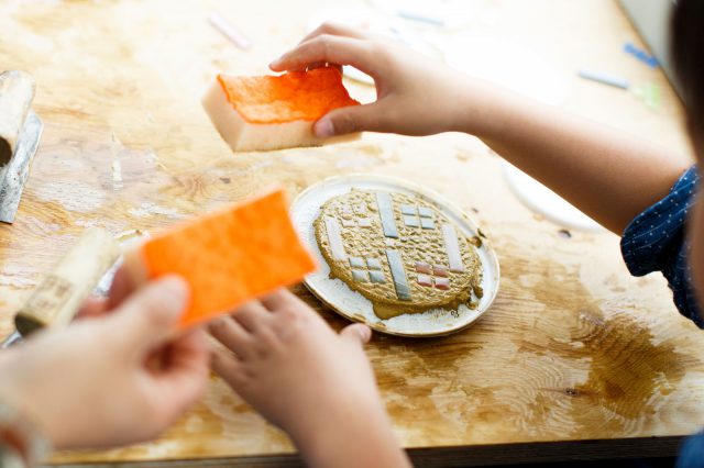 左官屋さんの職人技「掻き落とし」を使った、デザインプレートづくり。コテで表面を撫でて、そのあとスポンジで拭き取っていきます。