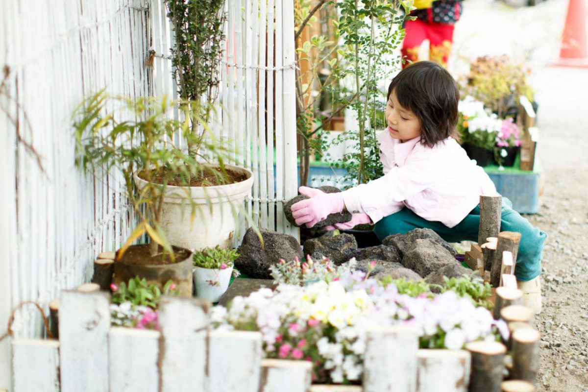 子どもたちによってできあがる庭のカタチは様々。お花がいっぱいに置いた子や、木材や石を多く使って立体的なお庭にしたりと、創造力に驚きます。