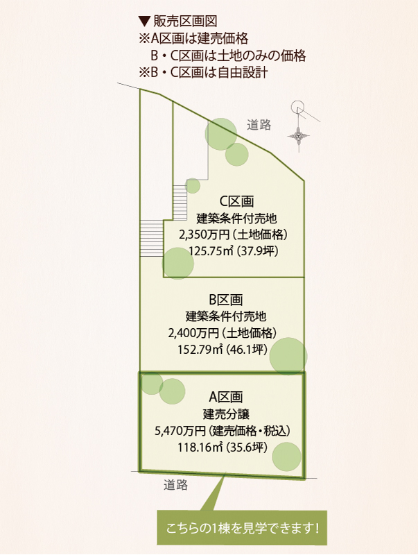 ●全体区画数:建売分譲1区画(A区画)、建築条件付売地2区画(B、C区画)●土地面積:118.16㎡~152.79㎡