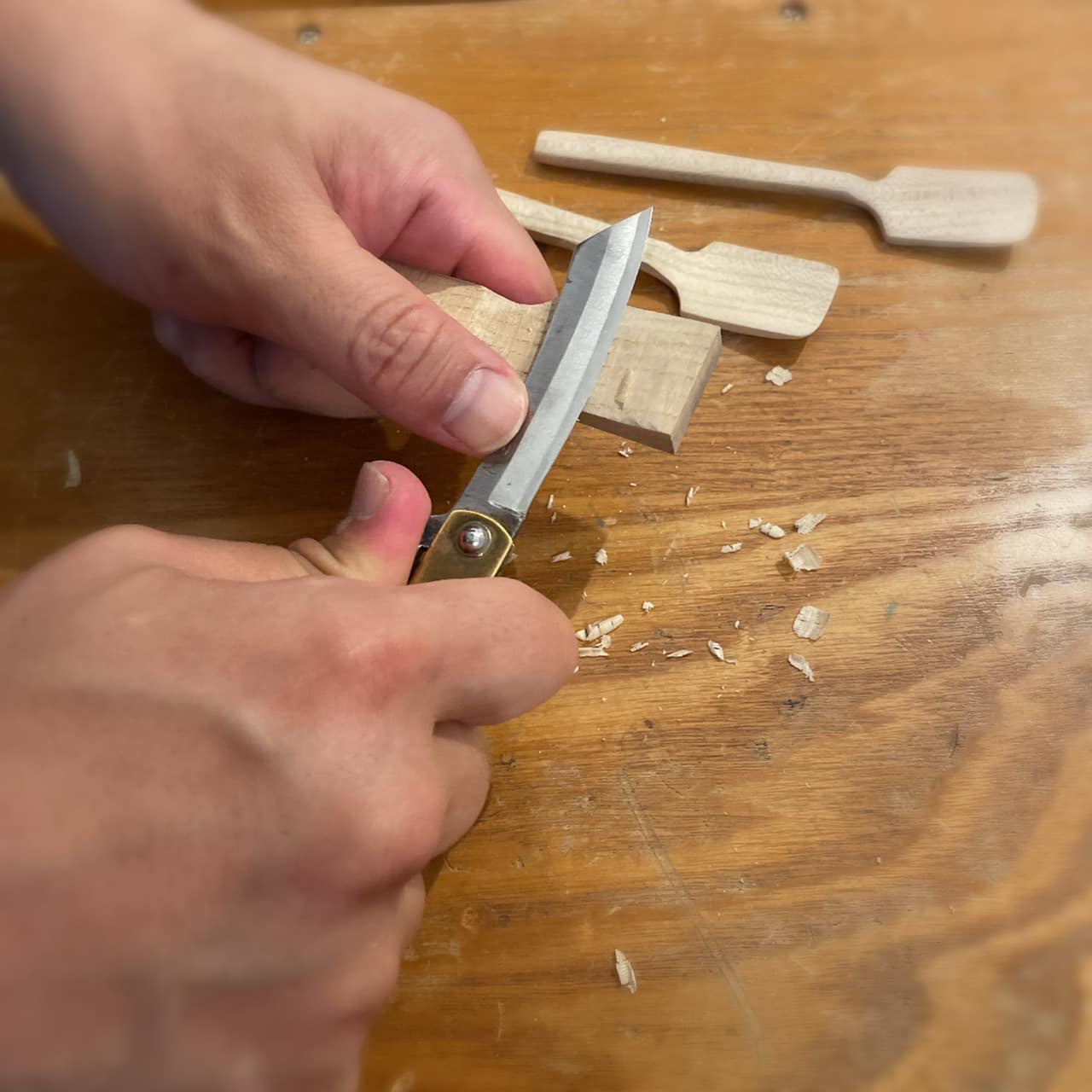 材料は市内公園の伐採樹木や東京・多摩産の木を活用。アイスクリームスプーンとミニヘラは削り方によって食べ物の味わいや、使いやすさも変化するかも…?