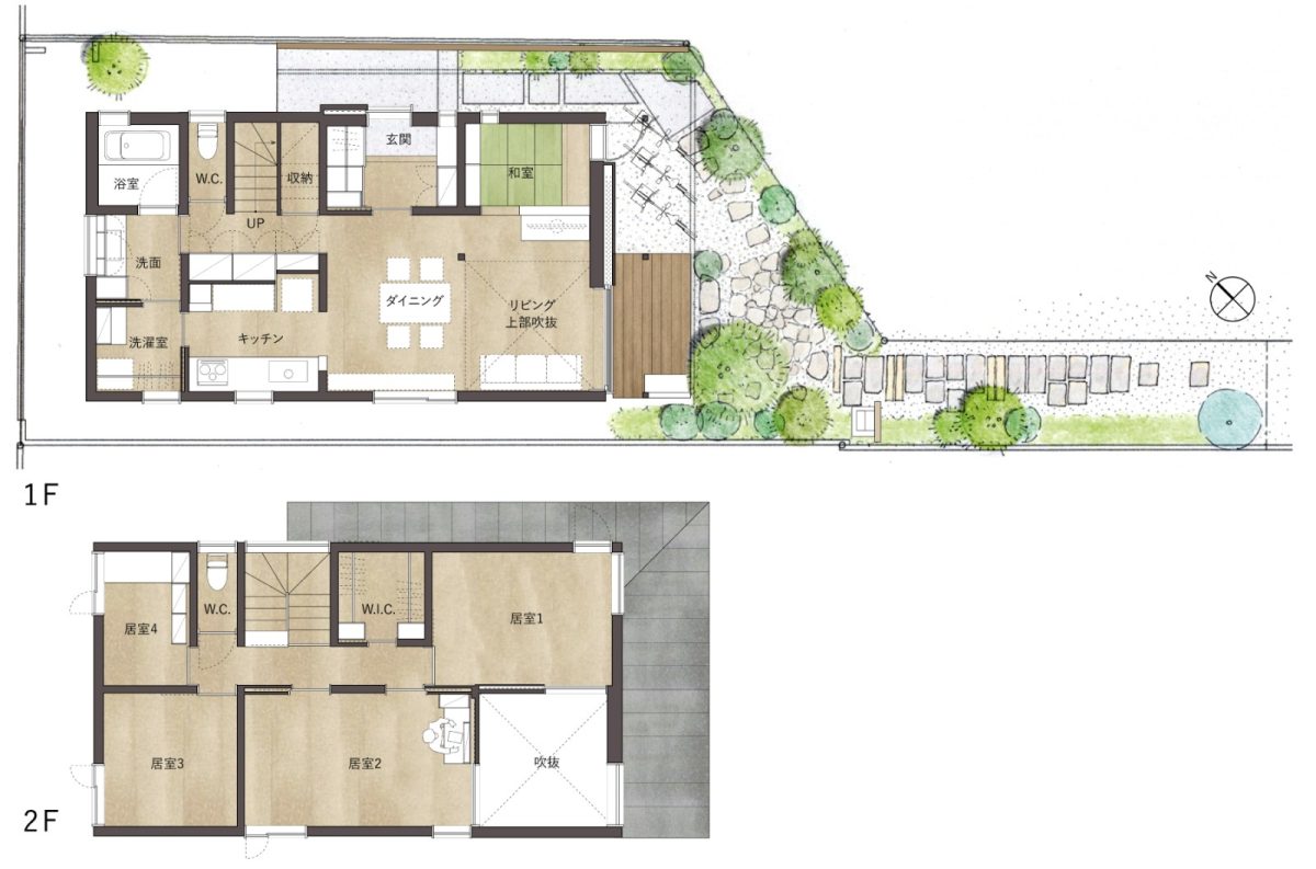 『いってきます』と『ただいま』を見守る、緑に囲まれた“みち”。道路から離れて家族で伸び伸びと過ごす“にわ”。二つが同居する豊かな外部空間「みちにわ」を軸に、家づくりを進めました。